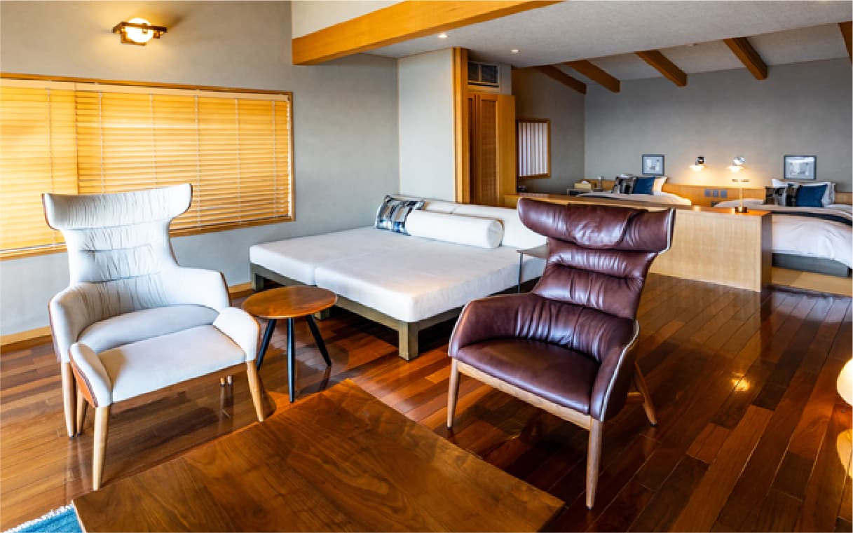 リビング15畳相当+デイベッド、露天風呂+シャワーブース