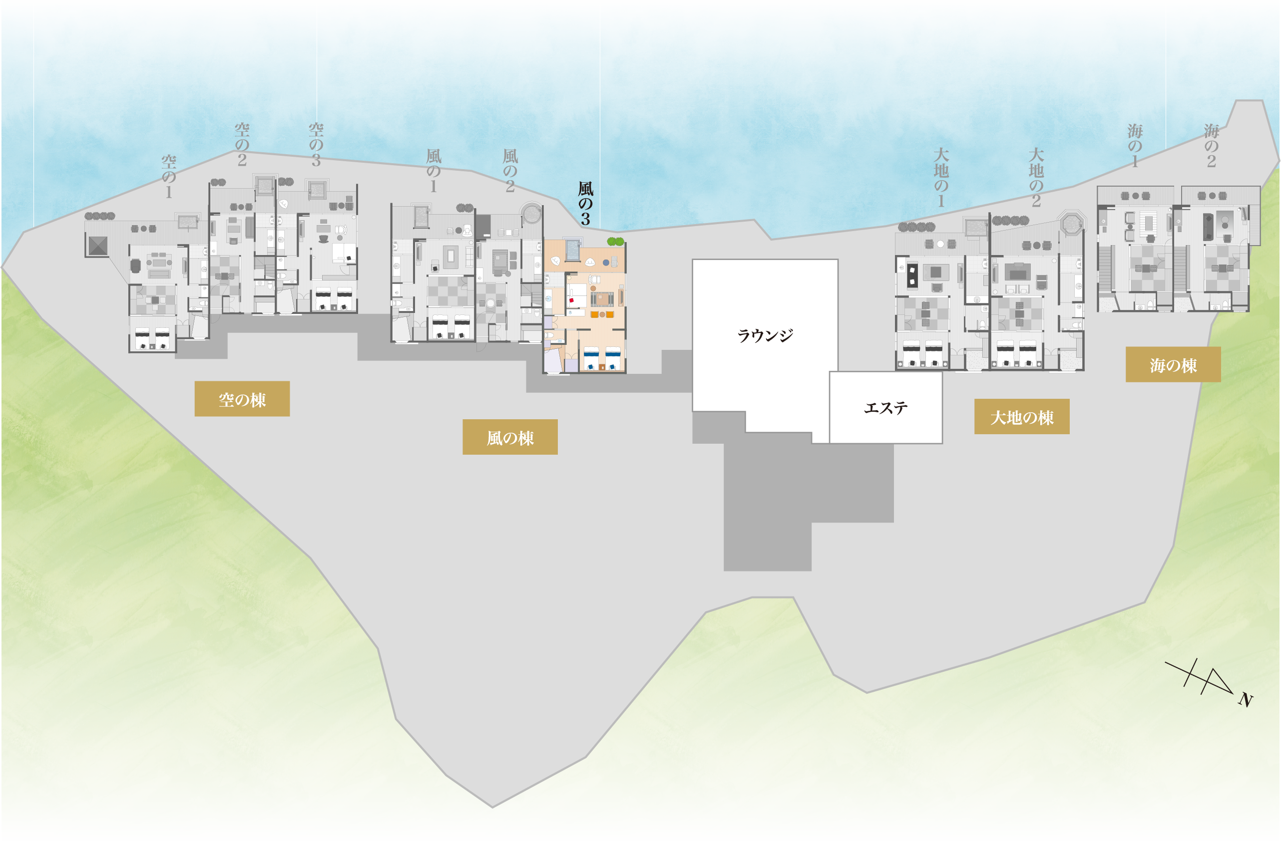 | 間取り | ツインベッドルーム、 リビング15畳相当+デイベッド、 露天風呂+シャワーブース |
