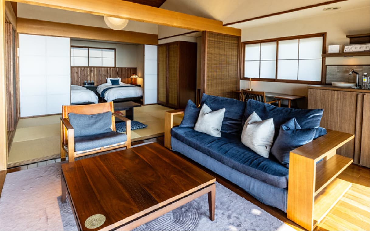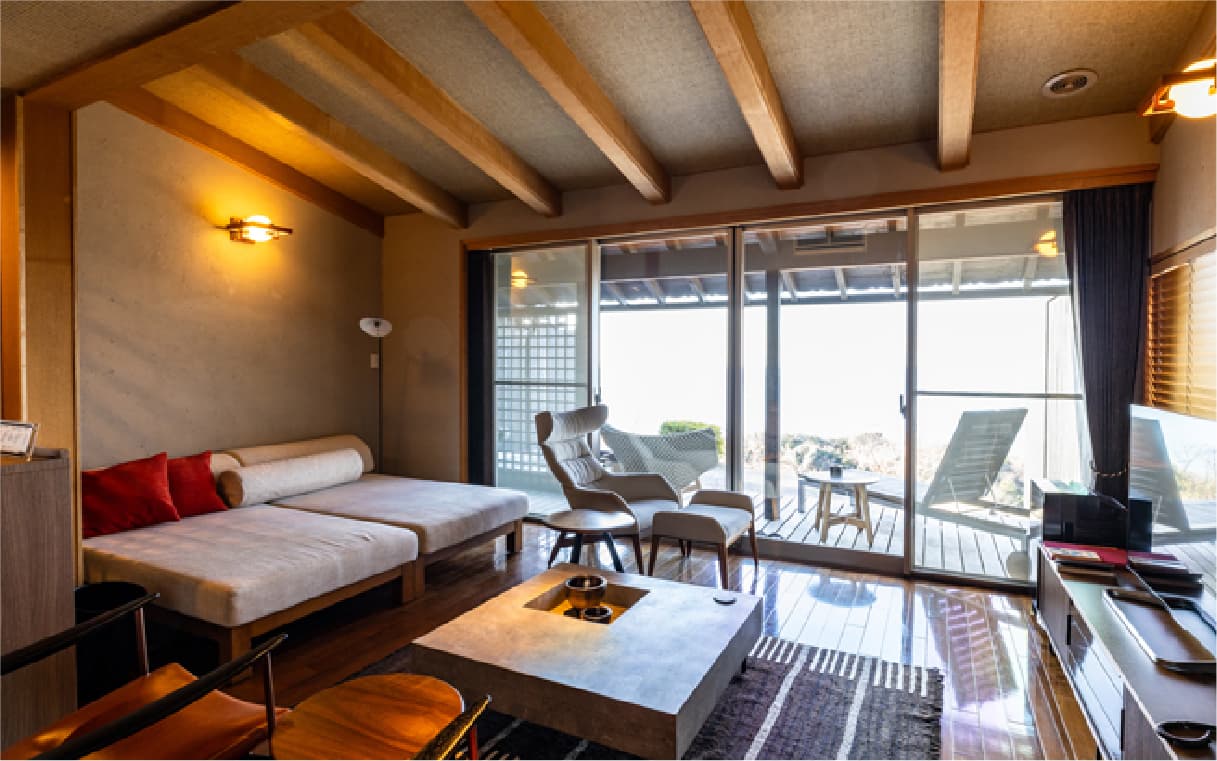 ウッドデッキも備え、お部屋毎に異なる風情にて、